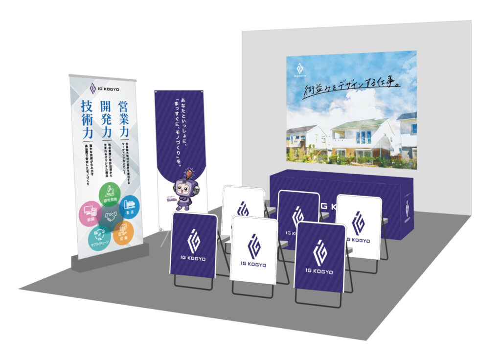 タペストリー、ロールスクリーンバナー、イスカバー、テーブルクロスなど、ブース全体をトータルコーディネートすることで、アイジー工業様の「モノづくりへの情熱」や「街並みをデザインする仕事」の魅力を、会場で最大限にアピールできる仕上がりとなりました。採用に関するツールをワンストップでお任せいただくことで、スムーズかつ満足度の高いブランディングを実現しています。